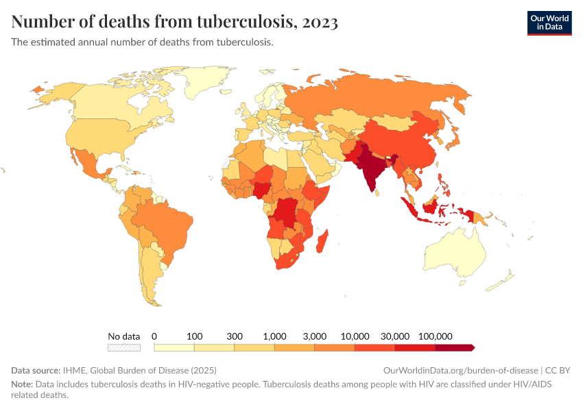 IHME, Global Burden of Disease (2024) – with minor processing by Our World in Data. “Number of deaths from tuberculosis” [dataset]. IHME, Global Burden of Disease, “Global Burden of Disease - Deaths and DALYs” [original data]. Retrieved September 17, 2025 from https://search-refactor-react-query.owid.pages.dev/grapher/tuberculosis-deaths