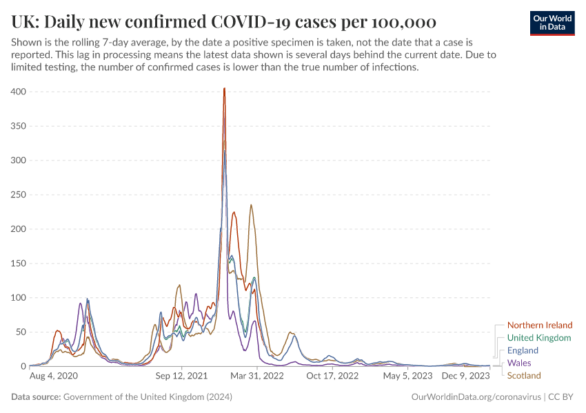 Government of the United Kingdom (2024) – with minor processing by Our World in Data. “UK: Daily new confirmed COVID-19 cases per 100,000” [dataset]. Government of the United Kingdom, “UKHSA data dashboard” [original data]. Retrieved September 17, 2025 from https://search-refactor-react-query.owid.pages.dev/grapher/uk-daily-covid-cases-7day-average