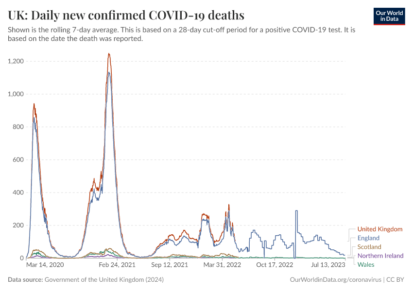Government of the United Kingdom (2024) – with minor processing by Our World in Data. “UK: Daily new confirmed COVID-19 deaths” [dataset]. Government of the United Kingdom, “UKHSA data dashboard” [original data]. Retrieved September 17, 2025 from https://search-refactor-react-query.owid.pages.dev/grapher/uk-daily-covid-deaths