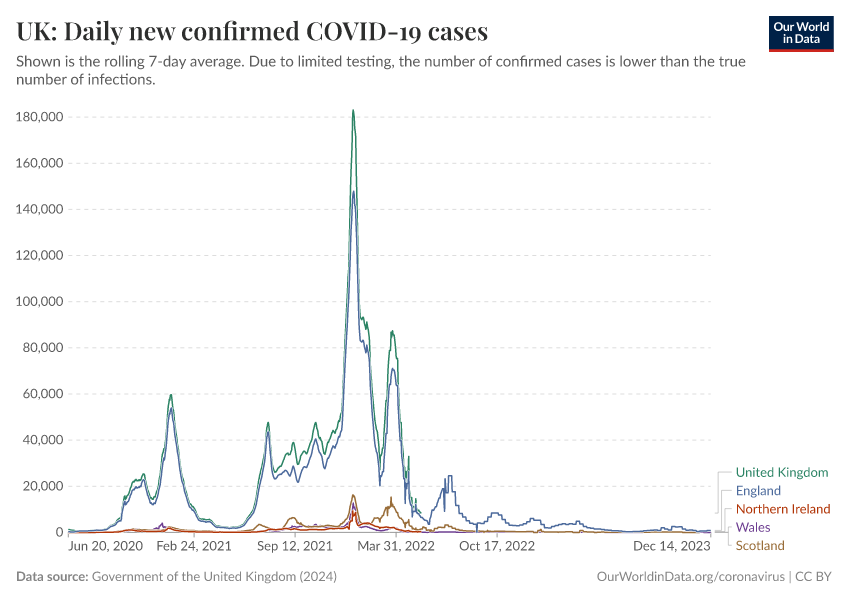 Government of the United Kingdom (2024) – with minor processing by Our World in Data. “UK: Daily new confirmed COVID-19 cases” [dataset]. Government of the United Kingdom, “UKHSA data dashboard” [original data]. Retrieved September 17, 2025 from https://search-refactor-react-query.owid.pages.dev/grapher/uk-daily-new-covid-cases