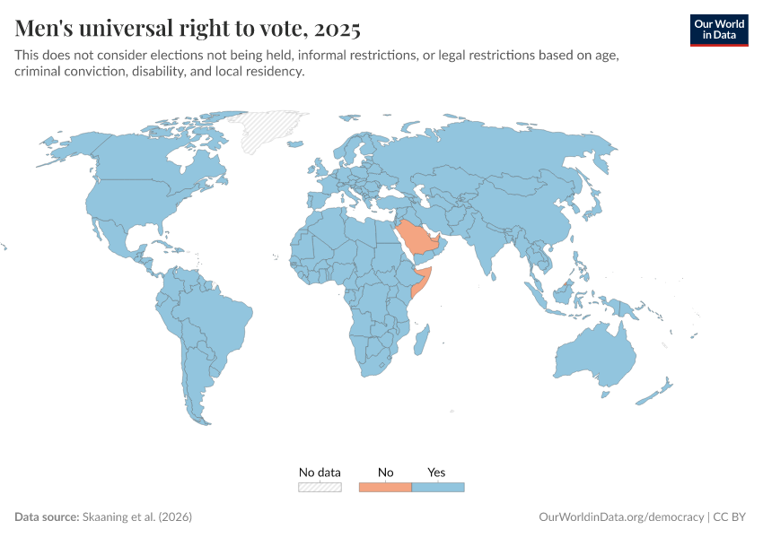 “Data Page: Men's universal right to vote”, part of the following publication: Bastian Herre, Lucas Rodés-Guirao, and Esteban Ortiz-Ospina (2013) - “Democracy”. Data adapted from Skaaning et al.. Retrieved from https://search-refactor-react-query.owid.pages.dev/grapher/universal-suffrage-men-lexical [online resource]How to cite this data