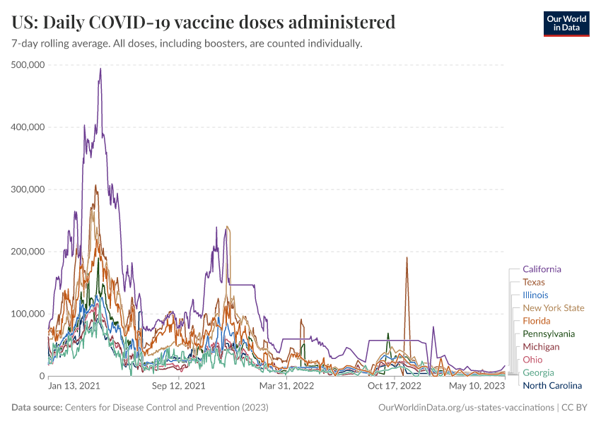Centers for Disease Control and Prevention (2023) – processed by Our World in Data. “US: Daily COVID-19 vaccine doses administered” [dataset]. Centers for Disease Control and Prevention, “COVID-19, Vaccinations (United States)” [original data]. Retrieved September 17, 2025 from https://search-refactor-react-query.owid.pages.dev/grapher/us-daily-covid-vaccine-doses-administered