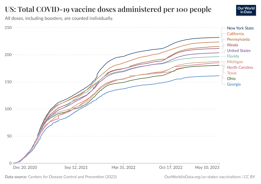 Centers for Disease Control and Prevention (2023) – processed by Our World in Data. “US: Total COVID-19 vaccine doses administered per 100 people” [dataset]. Centers for Disease Control and Prevention, “COVID-19, Vaccinations (United States)” [original data]. Retrieved September 17, 2025 from https://search-refactor-react-query.owid.pages.dev/grapher/us-state-covid-vaccines-per-100