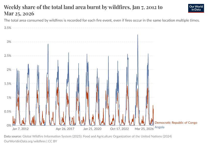 “Data Page: Weekly share of the total land area burnt by wildfires”, part of the following publication: Hannah Ritchie, Pablo Rosado, and Veronika Samborska (2024) - “Climate Change”. Data adapted from Global Wildfire Information System, Food and Agriculture Organization of the United Nations. Retrieved from https://search-refactor-react-query.owid.pages.dev/grapher/weekly-share-of-the-total-land-area-burnt-by-wildfires [online resource]How to cite this data