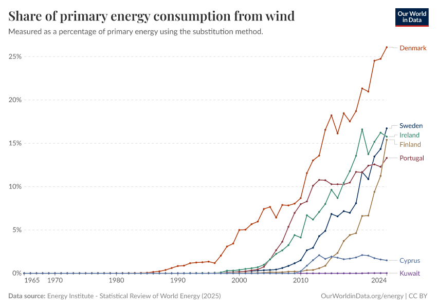 Energy Institute - Statistical Review of World Energy (2024) – with major processing by Our World in Data. “Share of primary energy consumption that comes from wind power – Using the substitution method” [dataset]. Energy Institute, “Statistical Review of World Energy” [original data]. Retrieved September 17, 2025 from https://search-refactor-react-query.owid.pages.dev/grapher/wind-share-energy