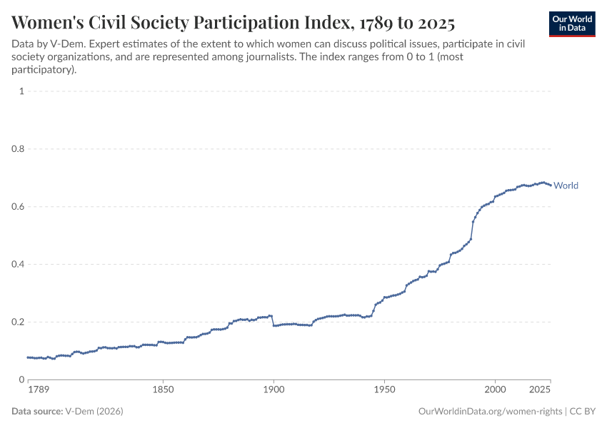 V-Dem (2025) – processed by Our World in Data. “Women's civil society participation index – (central estimate)” [dataset]. V-Dem, “Democracy report v15” [original data]. Retrieved September 17, 2025 from https://search-refactor-react-query.owid.pages.dev/grapher/women-civil-society-participation-index