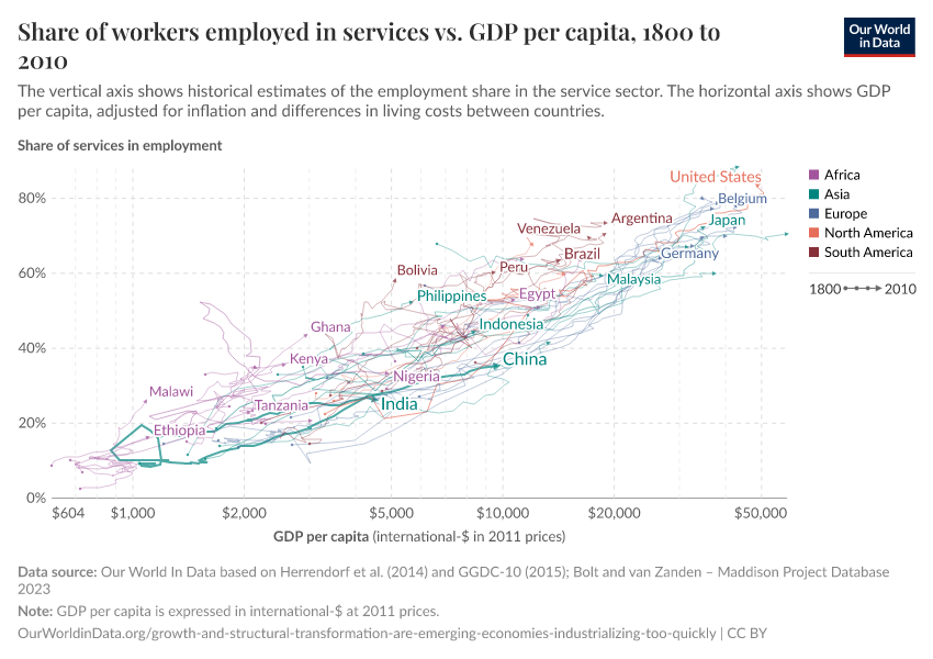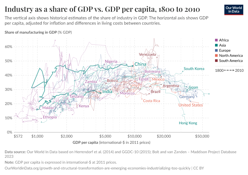 One way to study the process of ‘structural transformation’ across countries is to track how employment changes across sectors in the economy. The below chart does this, plotting the share of industry in total employment (vertical axis) against GDP per head (horizontal axis). This graph is a 'connected scatter plot' – each line shows the trajectory that a country followed over time along these two dimensions. Data is available for a selection of more than 40 countries, across all continents.