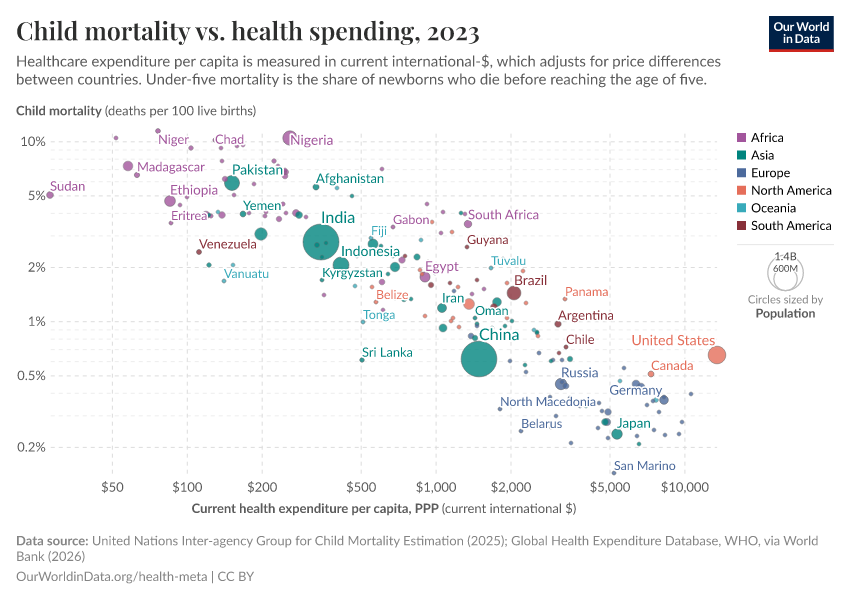 The chart below shows how healthcare spending is related to child mortality, in the same format.