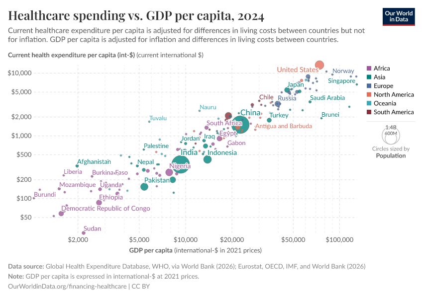 Countries with a higher per capita income tend to spend more on healthcare, which you can see in the chart below.2