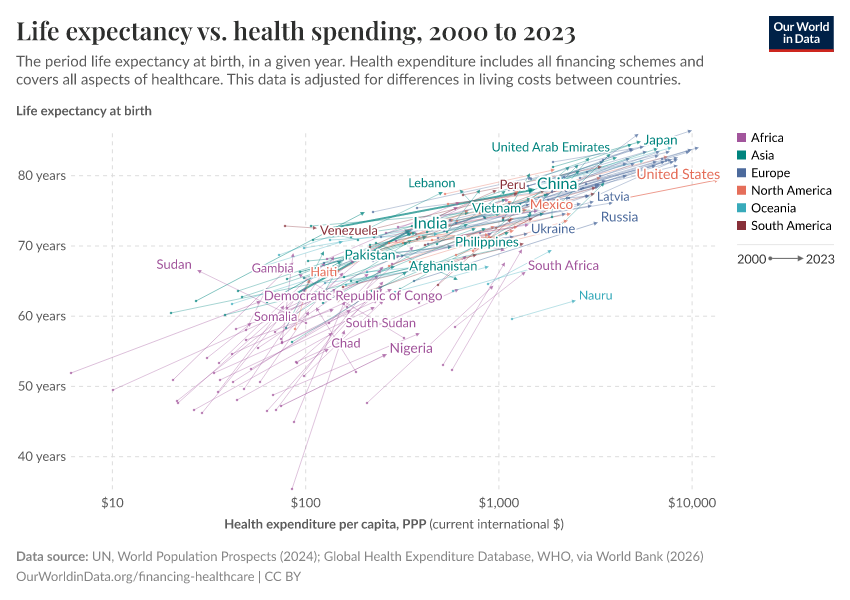 In the chart below, we can see a comparison between life expectancy and per capita healthcare expenditure across countries. The chart shows the change between 1995 and the latest year.