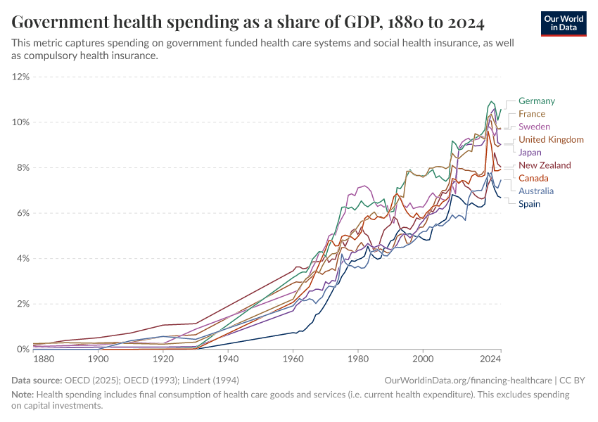 The chart here shows estimates of government spending on healthcare as a percent of GDP, for a selection of high-income countries using data from multiple sources.