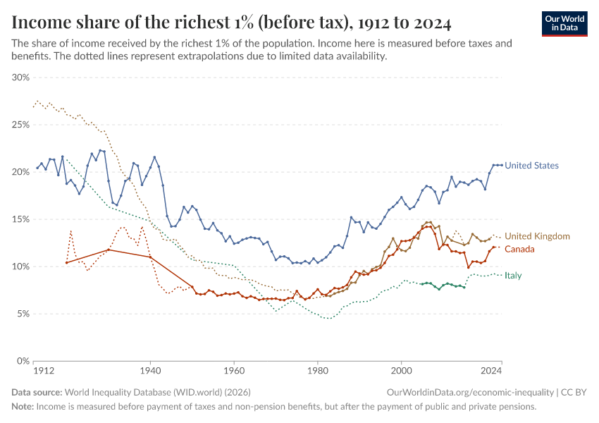 Below we show World Inequality Database estimates of the share of income received by the richest 1%. These data relate to income measured before taxes are paid and government benefits received.2