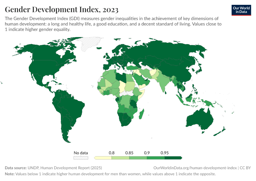 The GDI is the ratio of the female HDI to the male HDI. Values below 1 indicate higher human development for men than women, while values above 1 indicate the opposite. Values closer to 1 therefore indicate higher gender equality.
