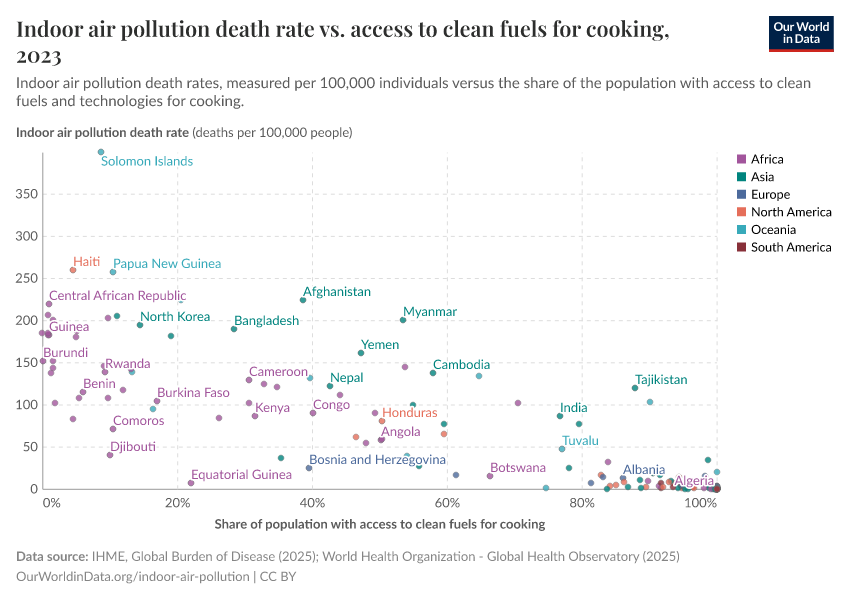 Low-income households tend to rely on solid fuels for cooking because cleaner fuels are either unavailable or too expensive. We, therefore, see a strong link between death rates from indoor air pollution and access to clean fuels for cooking.