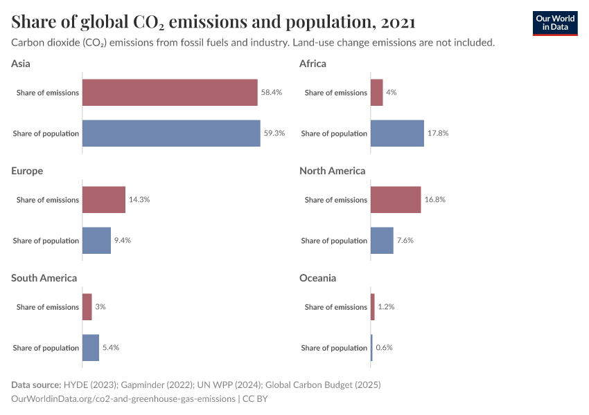 Europe, North America and Oceania all emit more than their ‘fair share’ based on population, whereas Africa and South America emit less.