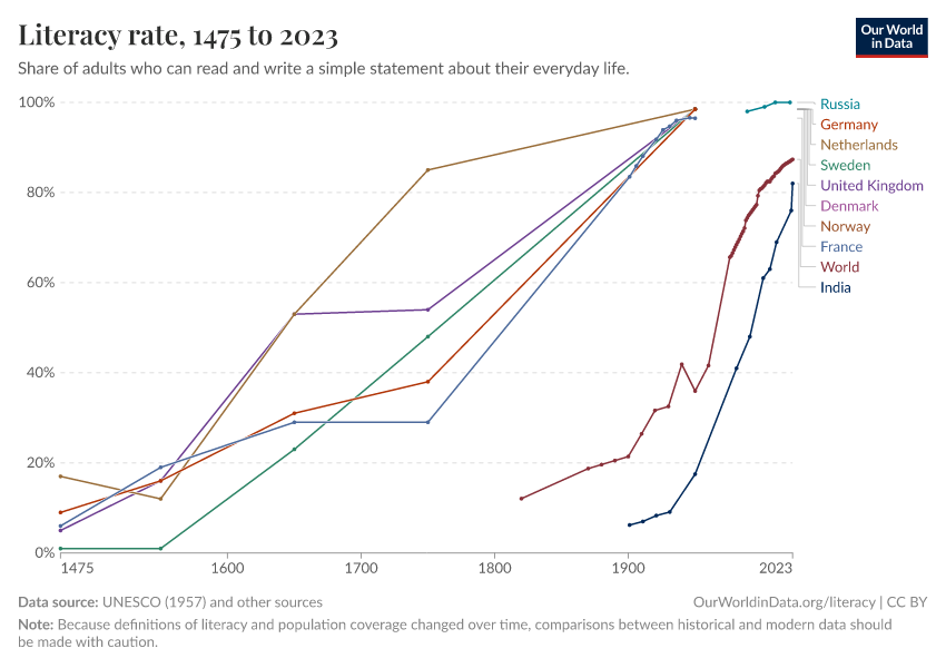 In many countries, more than 95% have basic literacy skills. Literacy skills of the majority of the population are a modern achievement as we show below.