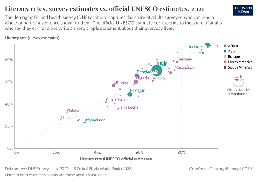 In the chart, we present a breakdown of UNESCO literacy estimates, showing the main methodologies used and how these have changed over time. (To explore changes across time, use the slider underneath the map.)