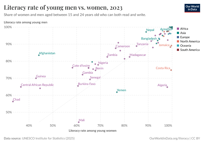 The visualization shows the literacy for rates for young men and women. In countries above the diagonal dashed line, literacy rates are higher for young men than for young women; this is the case for many poorer countries.