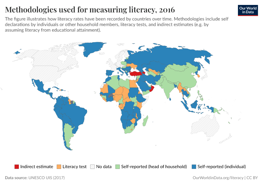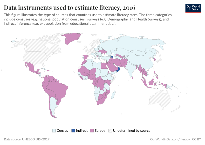 Here, we can see that most countries use sampling instruments (coded as 'Survey' on the map), although in the past census data was more common. Literacy surveys have the potential of being more accurate – when the sampling is done correctly – because they allow for more specific and detailed measurement than short and generic questions in population censuses.