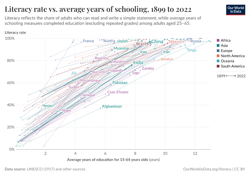 The correlation between educational attainment and literacy holds across countries and over time. The next chart shows this by plotting changes in literacy rates and average years of schooling.