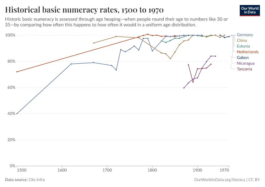 Numeracy is the ability to understand and work with numbers. The visualization shows how this ability became more common in populations around the world based on a very basic definition of numeracy, the ability to state one's own age correctly.