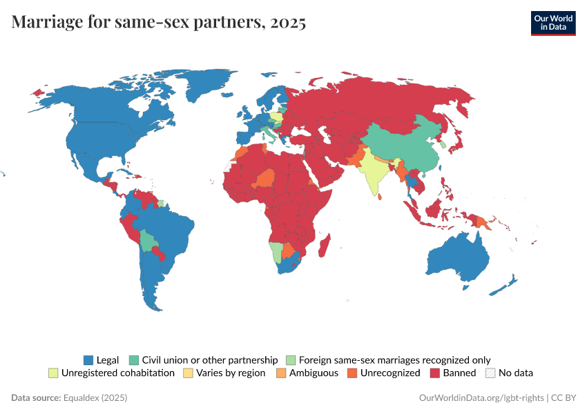 Despite this positive trend, much remains to be done to improve the rights of same-sex couples. In most countries, same-sex marriage remains illegal, and as the charts show, some countries have explicitly banned same-sex marriages in recent decades.