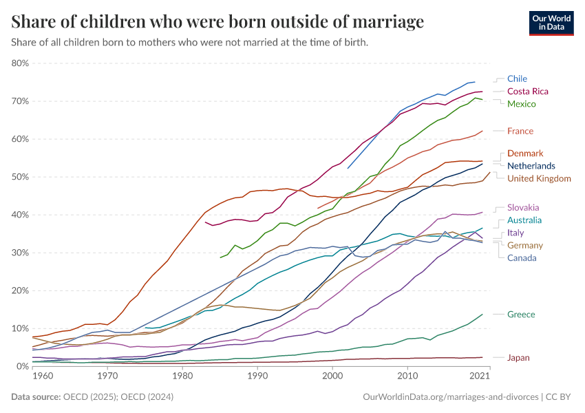 In 1970, less than 10% of children were born outside of marriage in most OECD countries. In 2020, this share had increased to more than 30% in most countries and to more than half in some.