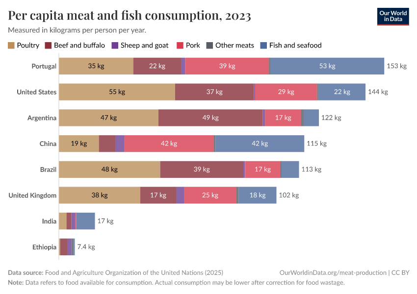 In the charts here we see the per capita consumption of different meat types by country.