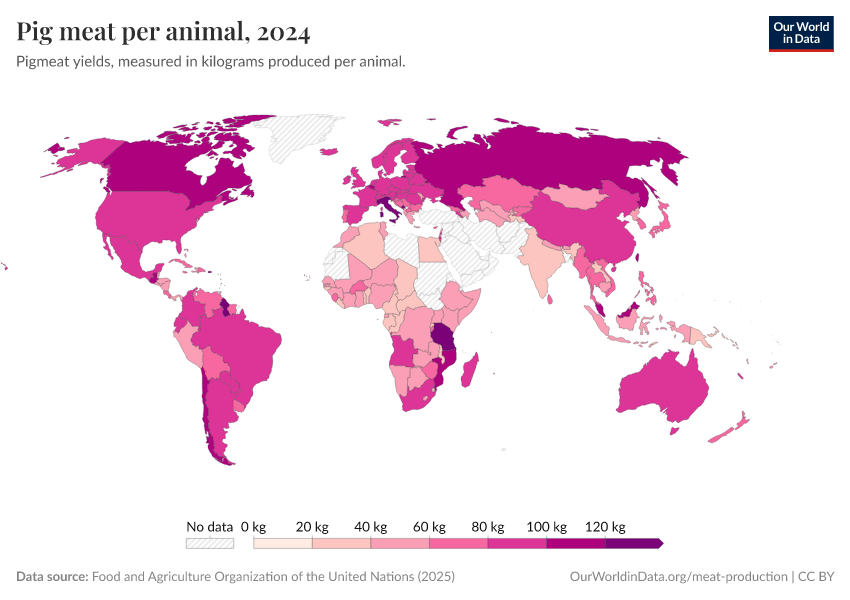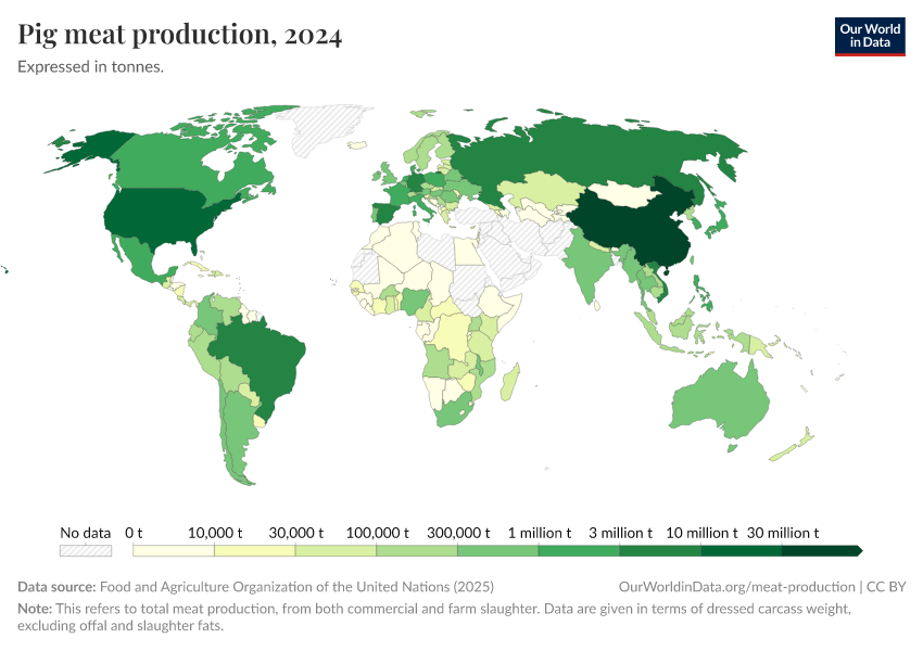 Since the early 1960s, global pigmeat production has also expanded significantly. China is the leading producer, contributing a substantial portion of the world's total pigmeat output. The growth in Chinese pigmeat production has been particularly rapid over the past couple of decades.