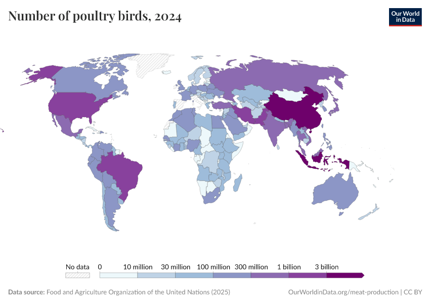 Global production of poultry meat has seen a dramatic rise over the last 50 years, multiplying significantly since 1961. Global trends in poultry production are shown in the chart.