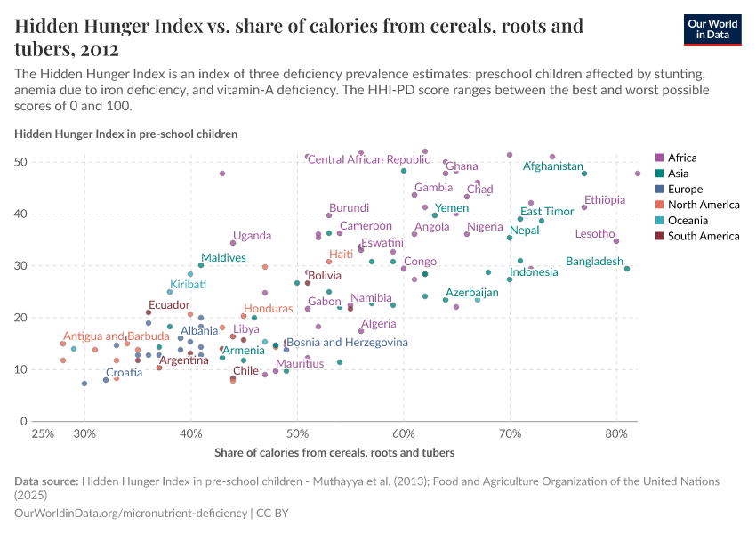 In the chart, you can see the hidden hunger index in children versus the share of dietary energy attained through the consumption of cereals, roots, and tubers.
