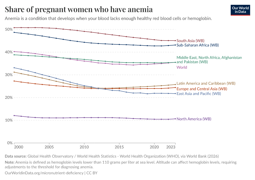 In the chart, we see the prevalence of anemia in pregnant women. Globally, around a third of pregnant women worldwide are anemic.