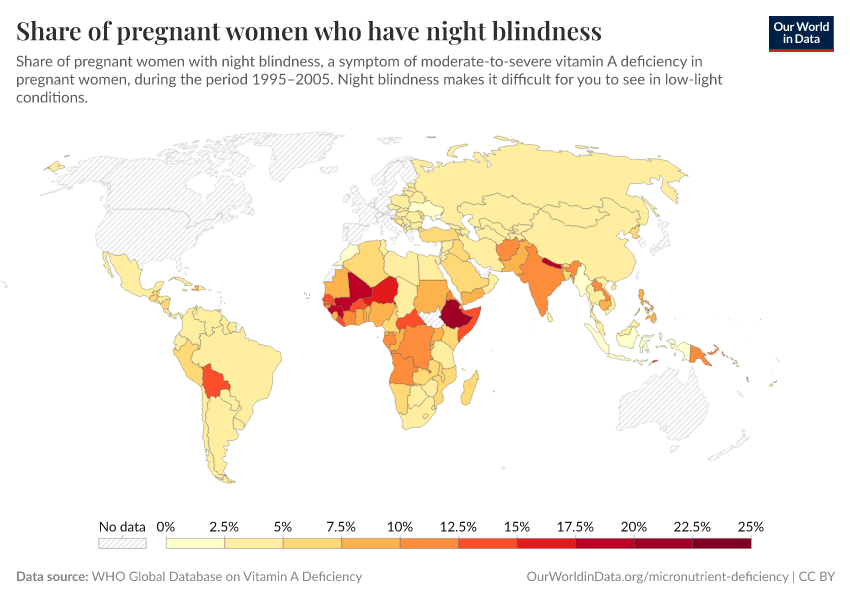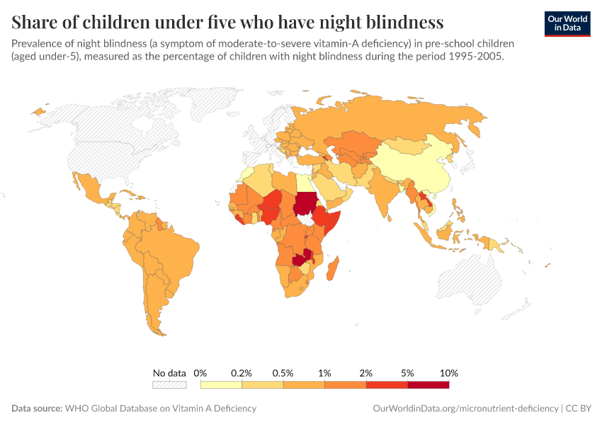 The prevalence of night blindness in most countries is low. However, several countries across sub-Saharan Africa and South Asia record much higher rates.