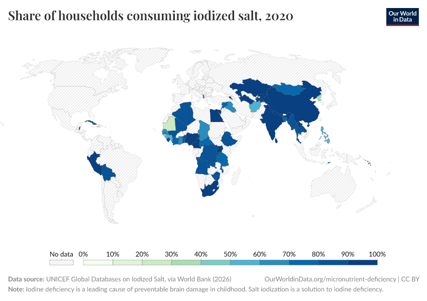 In the map, we see the share of households consuming iodized salt from 1993-2013. Overall, we see that in many countries, a large share of the population consumes iodized salt.