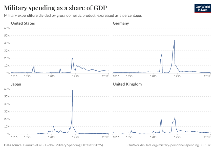 This chart shows military spending as a share of GDP for several countries. We see that since the end of the Second World War, there is a broad negative trend in military budget shares across world regions.