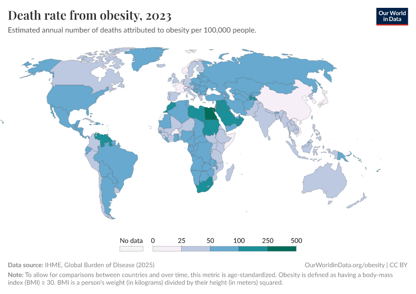 In the map here you can see differences in death rates from obesity across the world, per 100,000 people in the population.