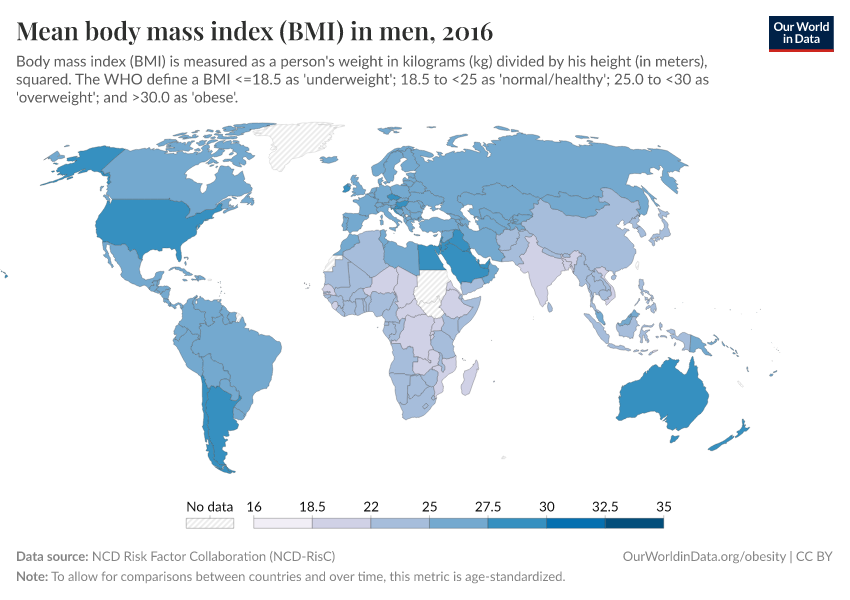In 2016, the global average (mean) BMI in men was estimated to be around 25, which is the cut-off for overweight. The average BMI tends to be higher in North and South America and North Africa, and lower in sub-Saharan Africa and Asia.