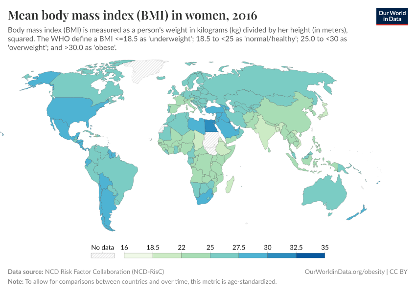 In 2016, the global average (mean) BMI in women was around 25, which is the cut-off for overweight. The average BMI tends to be higher in North and South America and North Africa, and lower in sub-Saharan Africa and Asia.