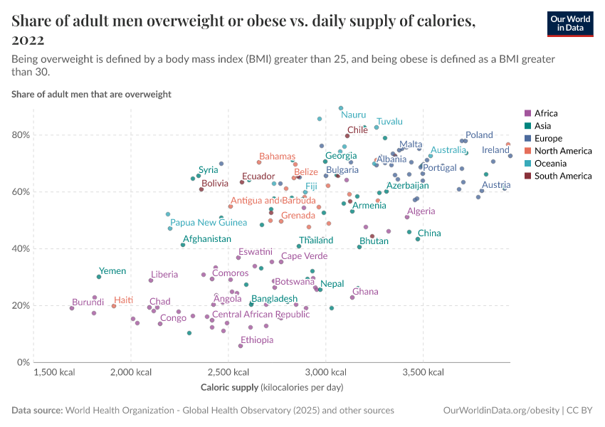 In the chart here, we see the relationship between the share of men who are overweight or obese versus the daily average supply of kilocalories per person.