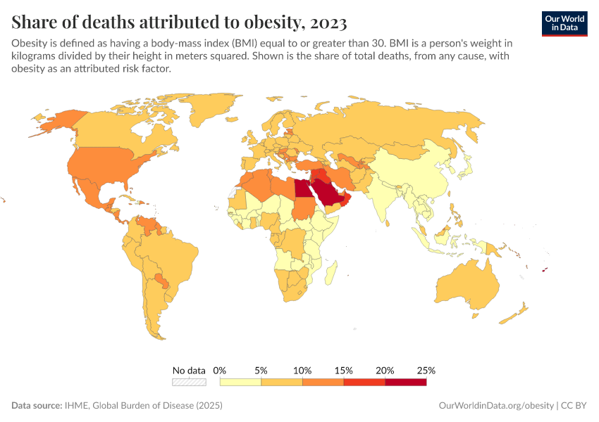 In 2019, in most high-income countries, the share of deaths attributed to obesity was in the range of 8 to 10%. In many middle-income countries, this share was almost twice as high.