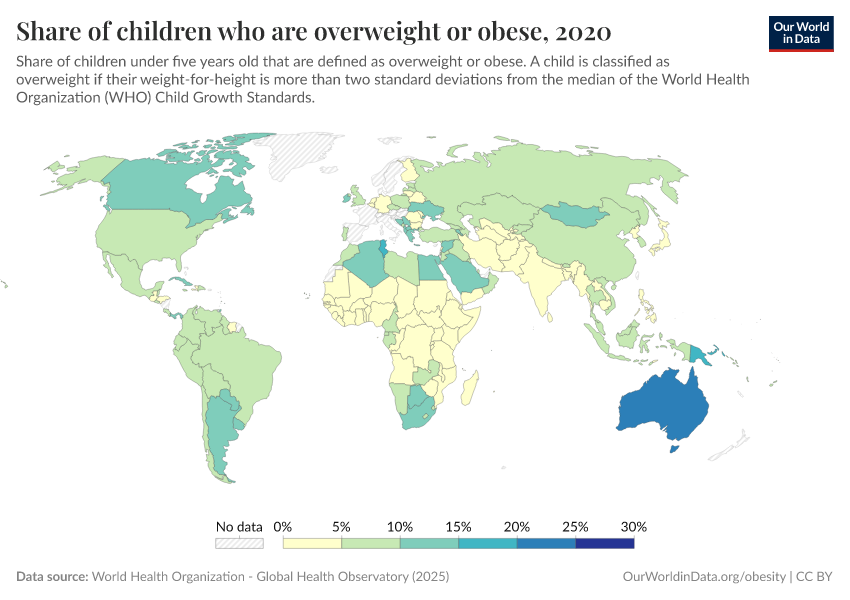 We also provide data on the share of adults that are either overweight or obese. This means having a BMI equal to or greater than 25.