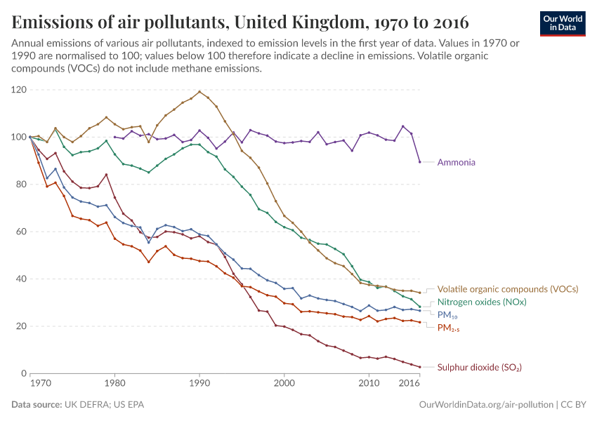 In the visualization, we see the relative change in air pollution emissions in the UK since 1970. Levels of emissions in 1970 (1980 for ammonia) are assigned a value of 100 – this means a value of 40 would mean emissions in the given year were 40% of what they were in 1970 (a 60% decline).