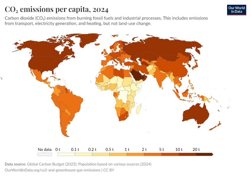 Hannah Ritchie (2019) - “Where in the world do people emit the most CO2?” Published online at OurWorldinData.org. Retrieved from: 'https://search-refactor-react-query.owid.pages.dev/per-capita-co2' [Online Resource]BibTeX citation