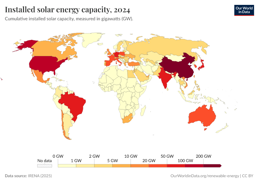 Energy generation is therefore a function of how much solar capacity is installed. This interactive chart shows installed solar capacity across the world.