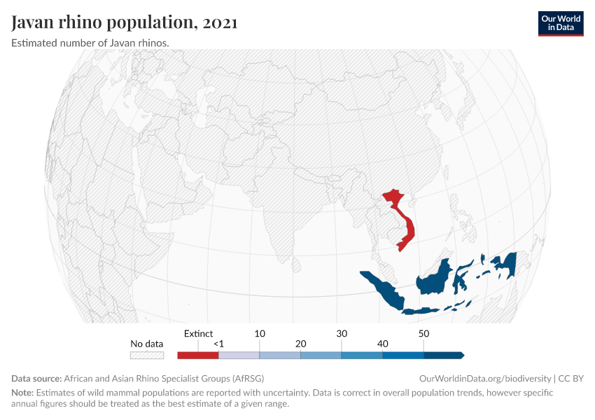 Its total population has, however, increased from 50 years ago. In the 1960s there were only 20 to 30 Javan Rhinos left in the world. From then until the 1990s, the population approximately doubled. The latest estimate puts this figure at 76 Javan Rhinos.