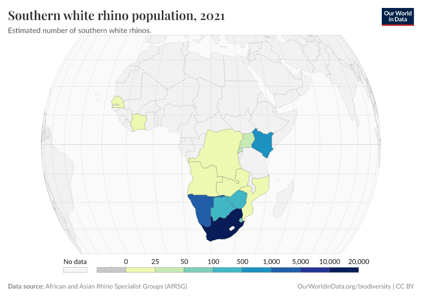 Over the last few years, increases in poaching rates have unfortunately led to another decline. South Africa is home to around three-quarters of Southern White Rhinos. You can explore population estimates by country in the chart.
