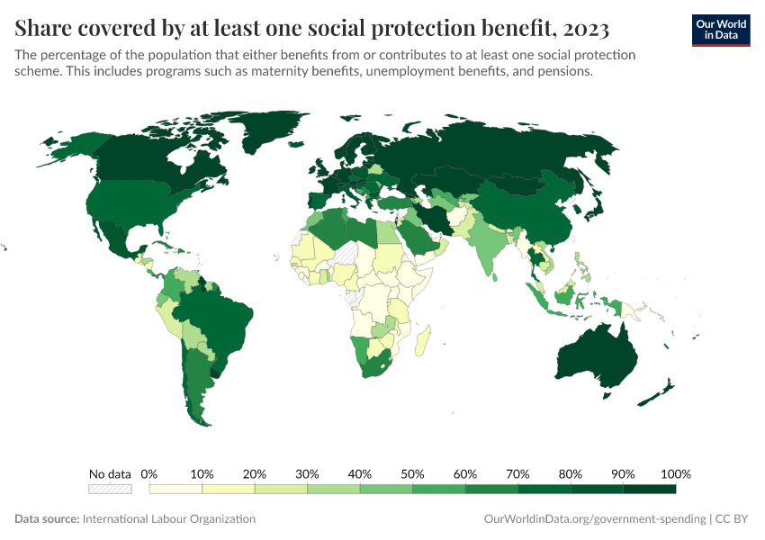 This indicator measures the share of the population effectively covered by a social protection system. Such systems include child and maternity benefits, support for persons without jobs, persons with disabilities, victims of work injuries, and older persons.