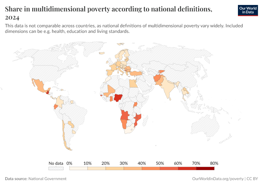 Related data: Data on multidimensional poverty, measured as the Multidimensional Poverty Index (MPI), can be found in this chart. This data has much better coverage across countries and time and is measured consistently, making it comparable between countries.