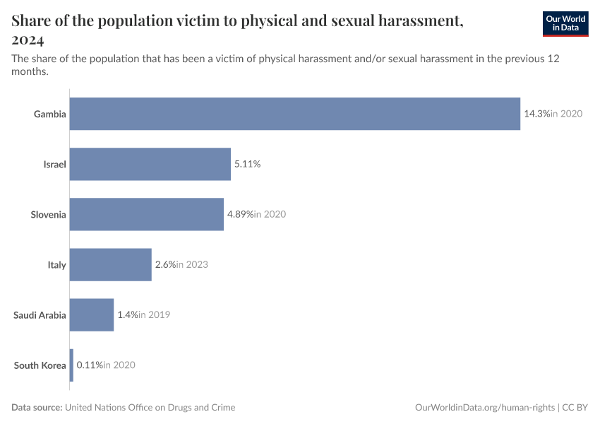Definition of the SDG indicator: Indicator 11.7.2 is the “proportion of persons victim of physical or sexual harassment, by sex, age, disability status and place of occurrence, in the previous 12 months” in the UN SDG framework.