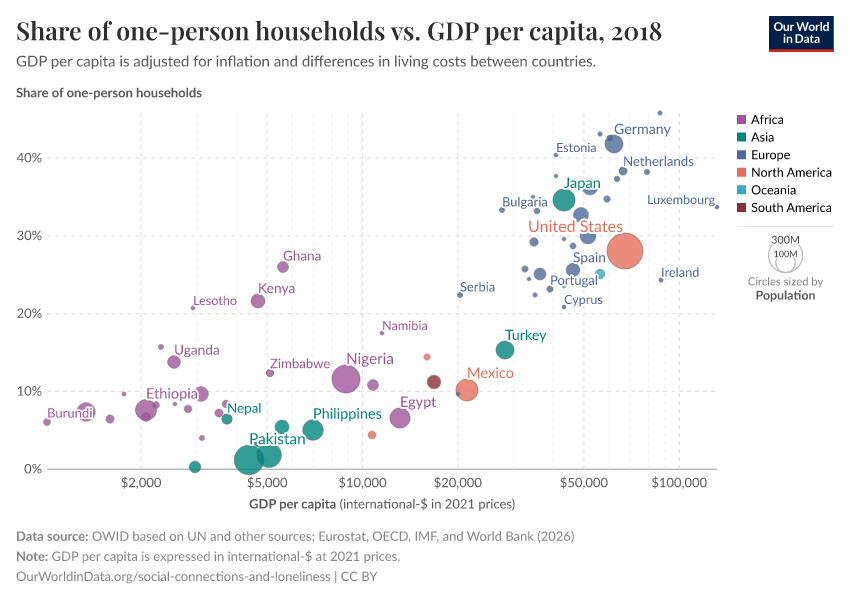 National income per capita and the share of one-person households are strongly correlated: As the chart here shows, people are more likely to live alone in rich countries.